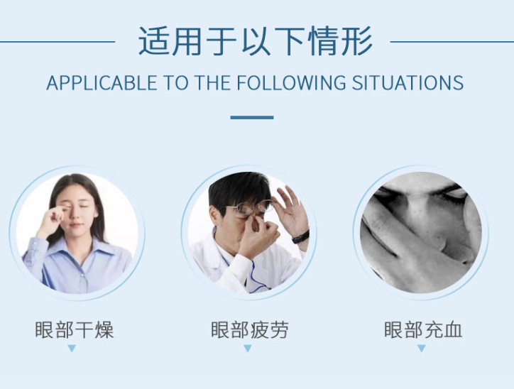 眼睛疲勞、佩戴軟性或硬性隱形眼鏡時的不適、預防眼病(游泳後、灰塵或汗水進入眼睛等)、視力模糊
