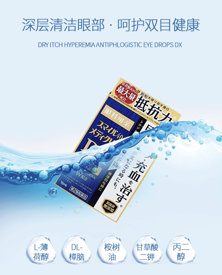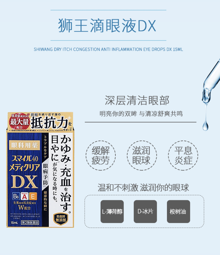 藥品通用名:LION/獅王 幹癢充血滴眼液DX眼藥水消炎15ml藥品名稱:LION/獅王日本進口乾癢充血滴眼液DX眼藥水消炎15ml適應症:眼睛發癢、結膜充血、視力模糊(眼眵多時)、預防眼病(游泳後、灰塵或汗水進入眼睛等)、眼睛疲勞、瞼緣炎