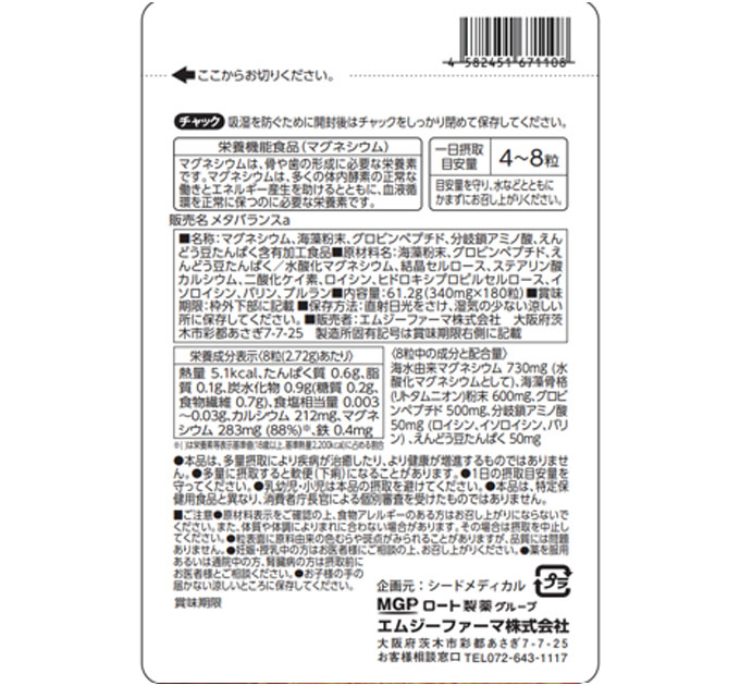 メタップ(グロビンペプチド)、海藻骨格(リトタムニオン)粉末、水酸化Mg、BCAA、えんどう豆たんぱく